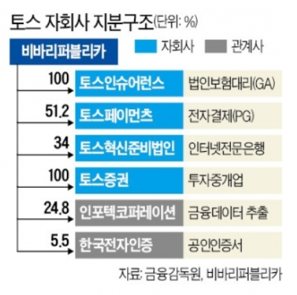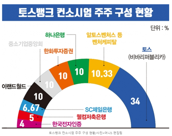 토스 MTS는 <토스증권>에서 서비스 예정이고 토스뱅크는 아래 그림의 <토스혁신준비법인>에 해당한다. 모회사인 <비바리퍼블리카>를 포함하여 모두 비상장이므로, 토스뱅크 컨소시엄의 주주 구성을 보고 관련주를 찾는다.