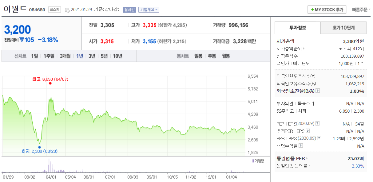 시가총액이 3300억원으로 앞선 금융주들보다 작은 규모이며 주가도 많이 오르지도 않고, 거래량도 매우 적다. 무엇보다 본업인 테마파크가 코로나 영향으로 계속 적자이며 기업가치가 많이 떨어졌다.