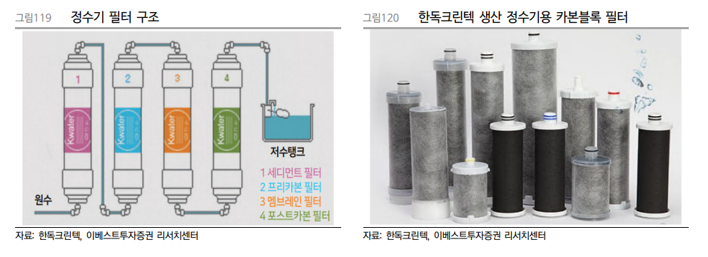 한독크린텍은 정수기의 카본필터를 생산하는 업체이다. 요즘 광고에 많이 등장하는 제품 중 하나는 단연 정수기이다. 정수기는 사용주기가 빈번하고 건강과 직결된 가전으로 이사/혼수 패키지에서도 반드시 포함되는 품목 중에 하나이다.