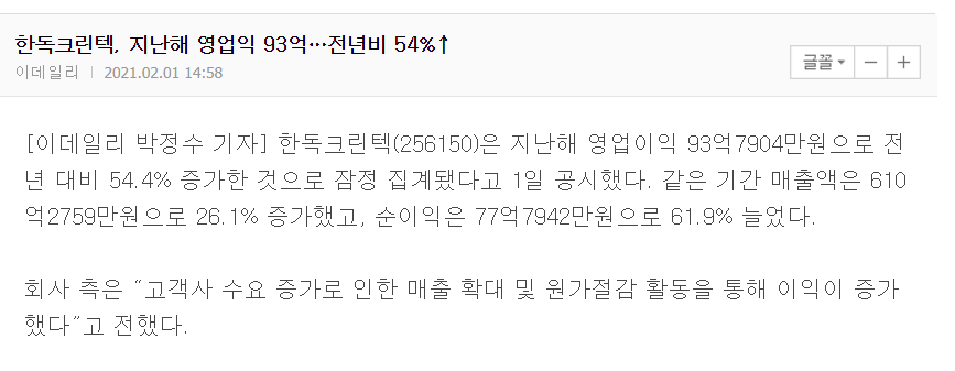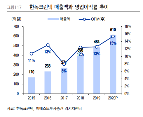 정수기의 필터는 소모품이며 주기적으로 교체수요가 발생한다. 여기에 정수기 시장 자체도 계속 성장하고 있으며, 국내정수기 업체들은 국내 시장뿐만 아니라 해외시장 진출에 힘쓰고 있다. 늘어나는 매출과 별개로 한독크린텍은 자동화 라인을 증설 중이며 2021년 상반기에 자동화 라인이 가동될 경우 영업이익률이 전년동기대비 2% 증가할 것으로 예측된다.