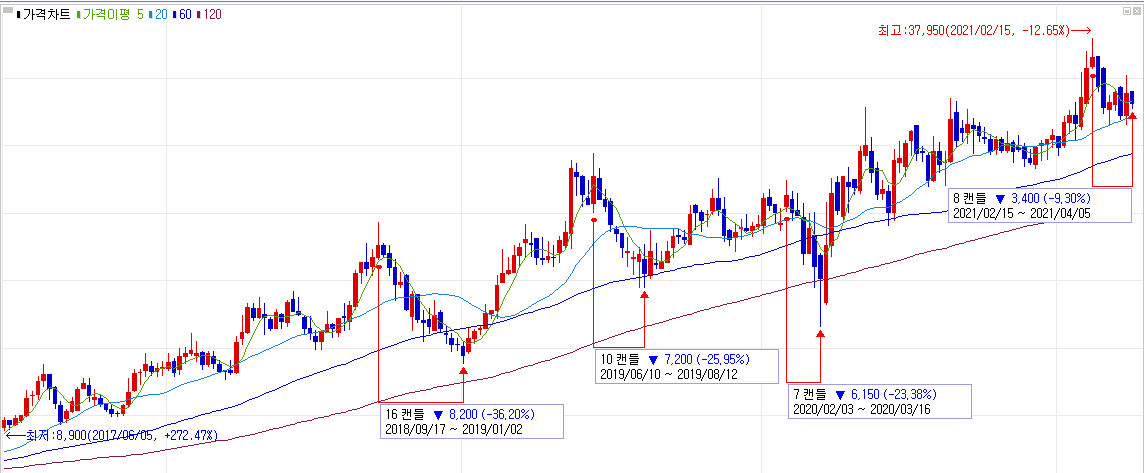 그리고 최근(2021/02/15 ~ 2021/04/05) 고점대비 -9.3%정도의 조정을 받고있다.