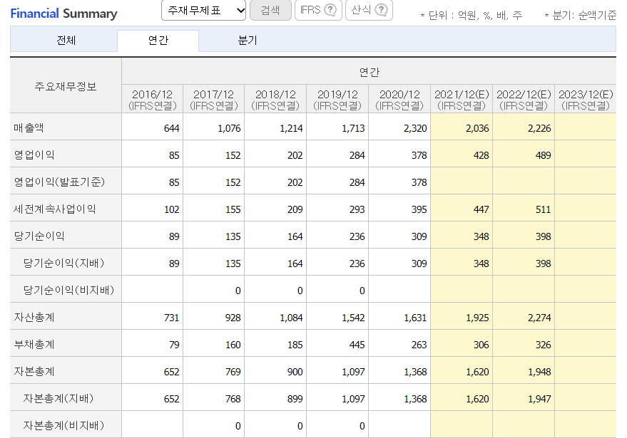 연간 매출 및 영업이익이 한해도 꺾인적 없이 꾸준히 성장했다.