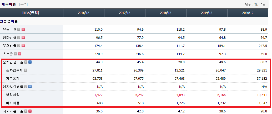 - 이익잉여금(결손금) : 영업활동으로 돈을 벌면 금액이 쌓이는 계정이다. 지속적으로 적자를 보고 있어서 이익잉여금은 2020년 말 301억까지 내려왔다. 지금과 같은 영업적자를 유지한다면 2021년에는 이익잉여금이 마이너스가 되어 자본총계를 감소시키기 시작한다.