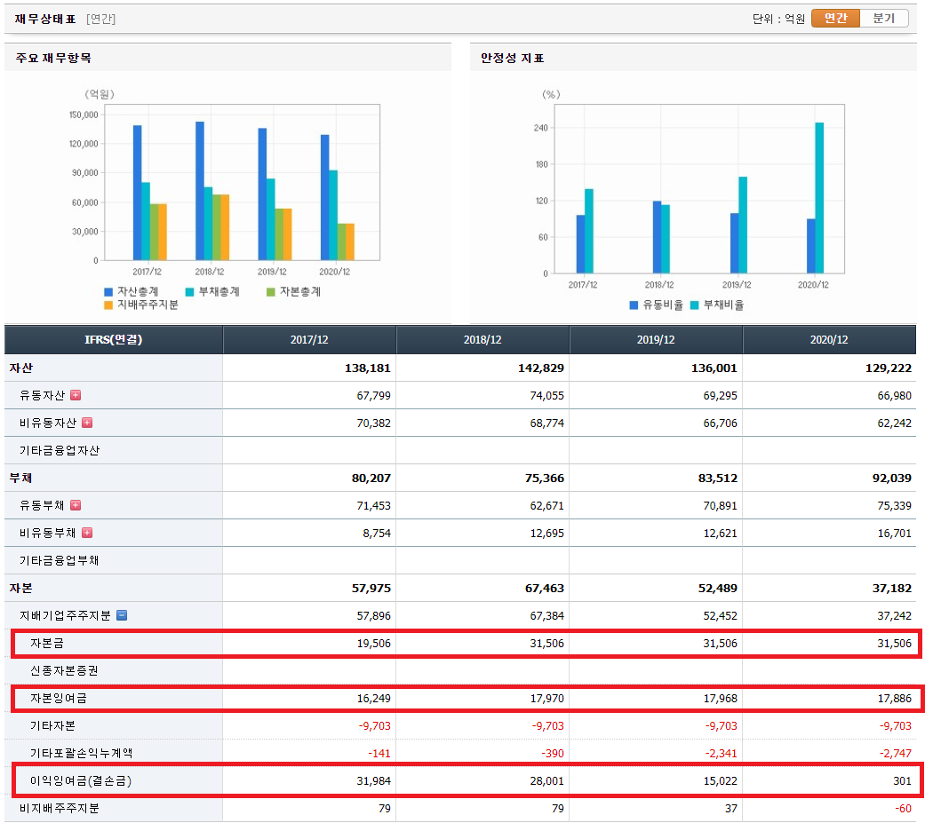 - 자본금 : 액면가 X 발행주식수로 2018년~2020년 사이에 변경이 없으므로 증자나 감자가 없던 것으로 보인다.