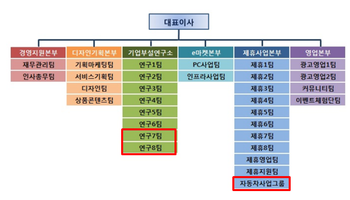 다나와의 조직에도 변경점이 있었는데 자동차 사업관련 팀이 그룹으로 명칭이 변경되었고 연구팀도 2팀이 더 증가했다. 기존에도 자동차와 관련하여 사업팀이 있었으나 '그룹'으로 이름을 바꿨다. 자세한 내용은 모르지만 팀에서 그룹으로 승격시켜 해당사업에 집중해보려는 의지가 나타난게 아닌가 싶다. 신규 증가된 연구팀 중 연구8팀은 자동차가 주력인 팀이다.