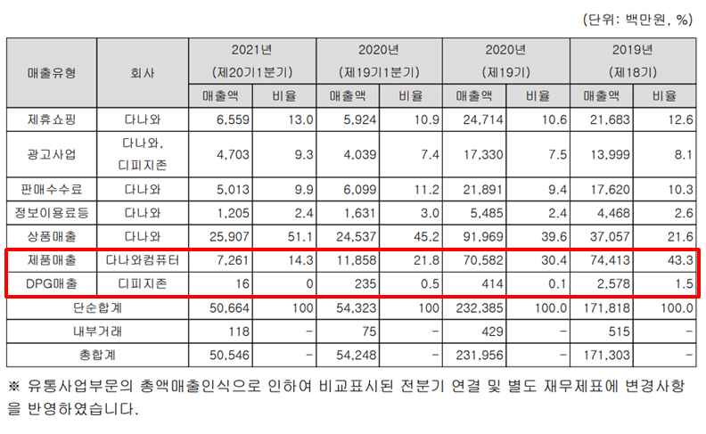 제휴쇼핑, 광고사업, 상품매출은 증가했고 판매수수료, 정보이용료, 제품매출, DPG매출은 감소했다. 의미 있는 데이터는 다나와컴퓨터의 제품매출이 크게 줄어든 것이다. 제품매출은 PC케이스 등 제품에 대한 조달사업인데 1분기에는 사업이 없었는지 아니면 수주가 힘들었는지 의미있게 감소했다.