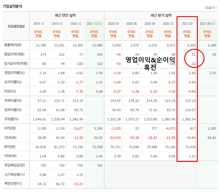 아래 영업이익 및 매출을 보면 1분기만 빨간 박스로 표시했다.(제일 오른쪽 박스가 2021년 1분기 데이터이다.)