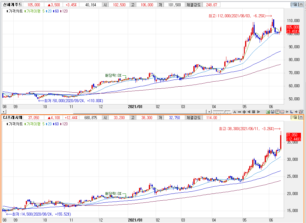 두 기업은 사업영역, 차트, 수급 모두 비슷하다. 차이점이라면 신세계푸드는 브랜드를 내세워 사업을 확장중이고, CJ프레시웨이는 수익성 개선을 통해 내실을 다진다는 점이다.