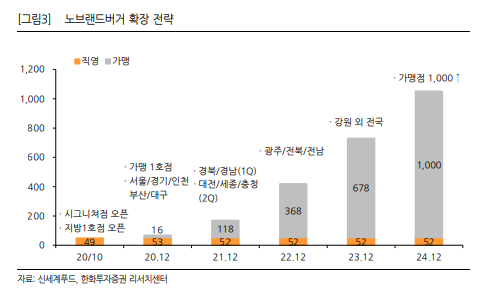 신세계푸드의 실적은 노브랜드버거의 성공여부가 크게 영향을 미칠것으로 판단된다. 올해 말까지 170개, 2024년까지 1000개 매장을 목표로 확장중인 만큼 성공한다면 규모의 경제를 활용하여 수익성이 높을 것이다.