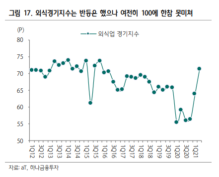 - 2020년 코로나로 인해 큰 불황을 겪었으며 2021년 1분기에는 수익성 개선 노력을 통한 판관비 감소 및 외식 업황 개선으로 영업이익 흑자전환으로 컨센서스를 상회했다.