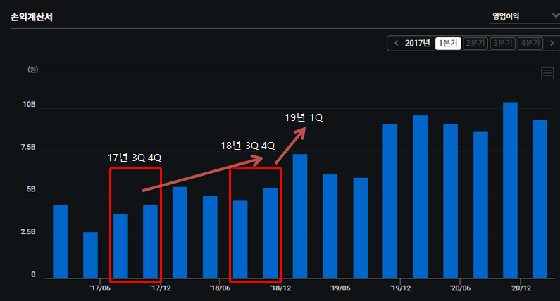 하락기가 18년 3Q~4Q에 걸쳐서 나타났는데 영업이익을 보면 18년 3Q, 4Q 모두 YoY 상승했고, 이어 19년 1분기는 신학기 특수에 그동안 쌓인 수요가 폭발했는지 엄청난 이익성장을 보여줬다. 이익증가에 따라 주가 퍼포먼스도 어마어마했다.