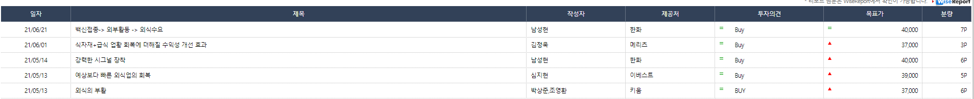 컨센서스가 상승하면서 목표주가도 상승하였고 현재 최고로 높게 책정된 목표주가는 40,000원이다. 현주가가 35,700원이므로 10% 조금 넘게 업사이드가 있지만 외식 보복소비에 따라 목표주가는 계속 올라갈 것으로 예상한다.