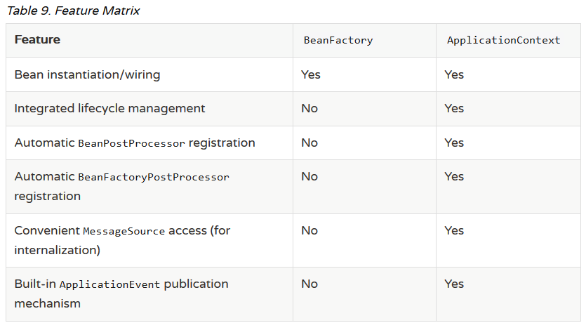BeanFactory(DefaultListableBeanFactory)는 기본적인 Spring의 IoC 기능을 API 제공하고 있다. 그럼에도 ApplicationContext 가 주로 사용되는 이유는 BeanFactory의 기능을 포함한 강력한 추가기능에 있다. 예를 들면, BeanPostProcessor를 이용한 기능확장 등이다.
