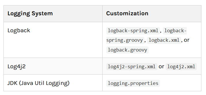 설정한 로그시스템에 따라 아래의 파일이 로드되어 환경이 구성된다. 디테일한 커스텀 설정을 위해서는 로그시스템 별로 아래 xml 파일이나 properties 파일을 작성한다.