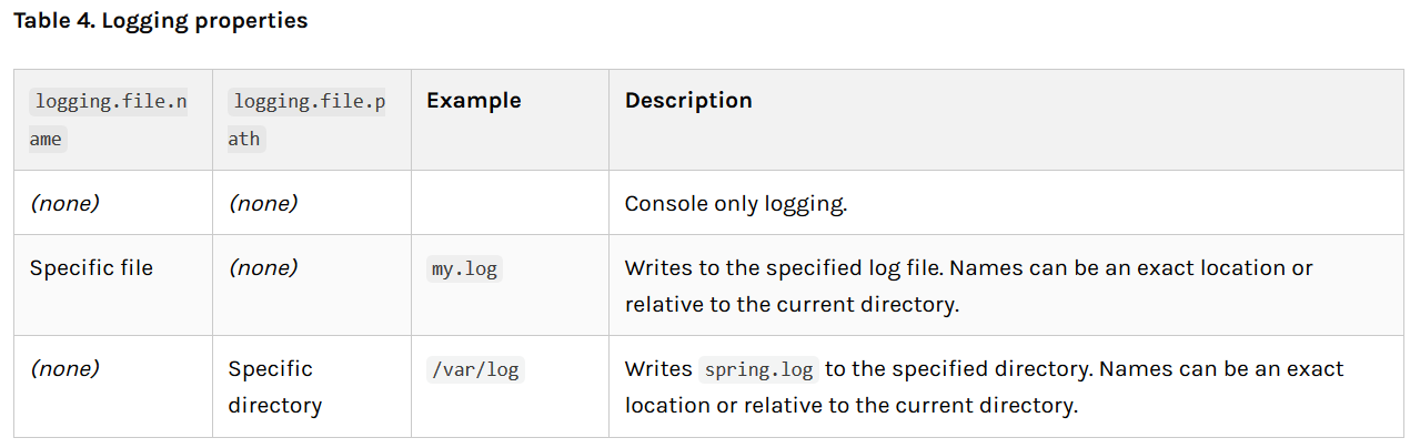 기본적으로 아무설정이 없다면 콘솔은 출력하지만 로그파일은 작성되지 않는다. 파일로 로그를 출력하고자 한다면 프로퍼티 설정파일에 logging.file.name 과 logging.file.path 프로퍼티를 추가한다.
