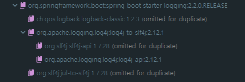 스프링부트는 Java Util Logging, Log4J2, Logback 이렇게 3가지에 대해 기본 설정을 제공하고 있다. spring-boot-starter-logging 의존성을 추가하면 로그관련 라이브러리들이 추가되는 것을 볼 수 있다.