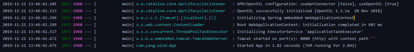 만약 ANSI를 지원하는 터미널을 사용한다면 프로퍼티 설정파일에 spring.output.ansi.enabled=detect 또는 always 옵션을 줘서 로그를 컬러풀하게 출력할 수 있다.