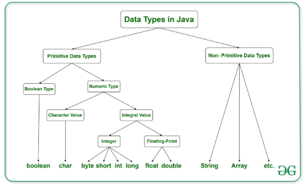 - Primitive Data Type : boolean, char, int, short, byte, long, float, double