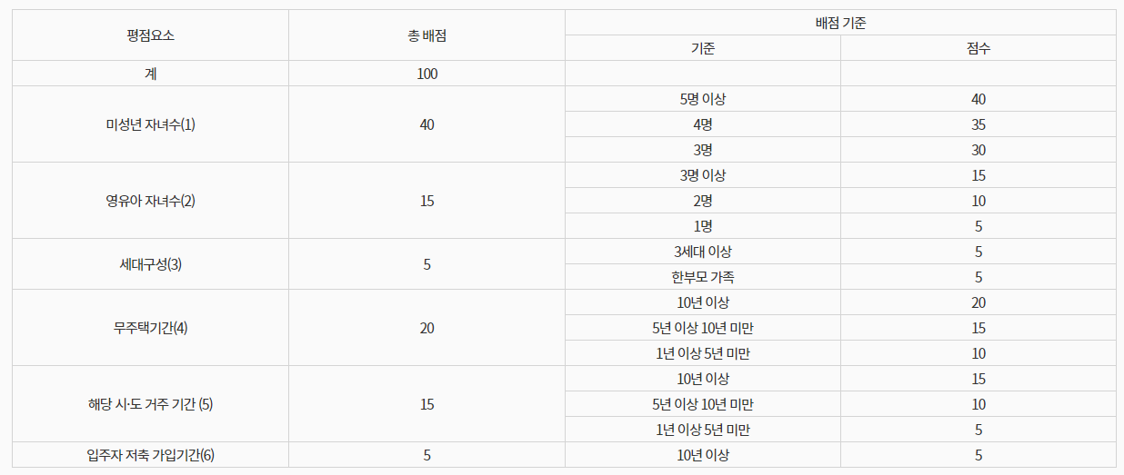 | 순위 경쟁시 처리 | 가점*의 다득점 순 → 추첨 * 가구소득(1점), 자녀의 수(3점), 해당 주택건설지역의 연속 거주기간(3점), 입주자저축 납입횟수(3점), 신혼부부는 혼인기간(3점)/ 한부모가족은 자녀나이(3점) |