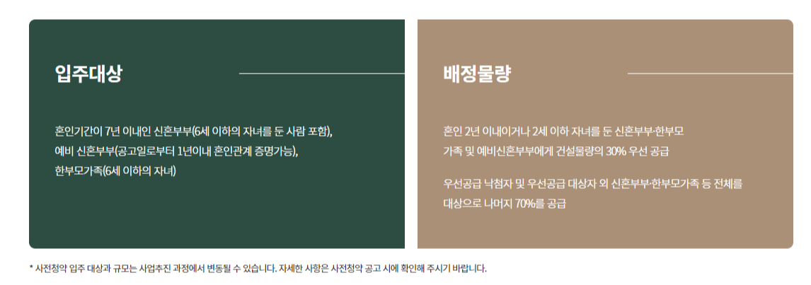 | 기본 | 혼인기간 7년 이내 신혼부부, 예비신혼부부(입주 전까지 혼인 사실을 증명), 6세 이하 자녀(태아 포함)를 둔 한부모가족 소득기준 100% 이하(맞벌이인 경우 120%) |