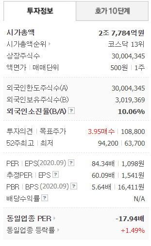 2020년 전체적으로는 마땅한 킬링 콘텐츠가 없었지만 2020년 후반에 공개된 스위트홈의 흥행을 보면 여전히 업계 1위의 제작능력을 입증한 것으로 보이고, 여기에 중국개방 호재까지 이어진다면 2021년에 스튜디오드래곤이 주도주가 될 수도 있다고 생각합니다. 현재 가격인 92,600원이 다소 부담스러울 수 있는 가격이지만 이 가격대에서 조금씩 모아가려고 합니다.