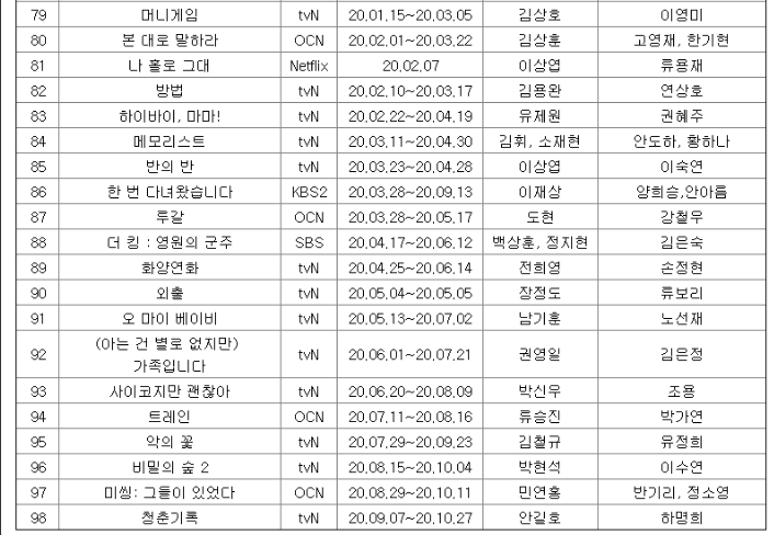 스튜디오드래곤의 2020년 드라마 라인업입니다. 최근에 넷플릭스에서 방영하고 있는 스위트홈은 반영되지 않은 목록입니다.