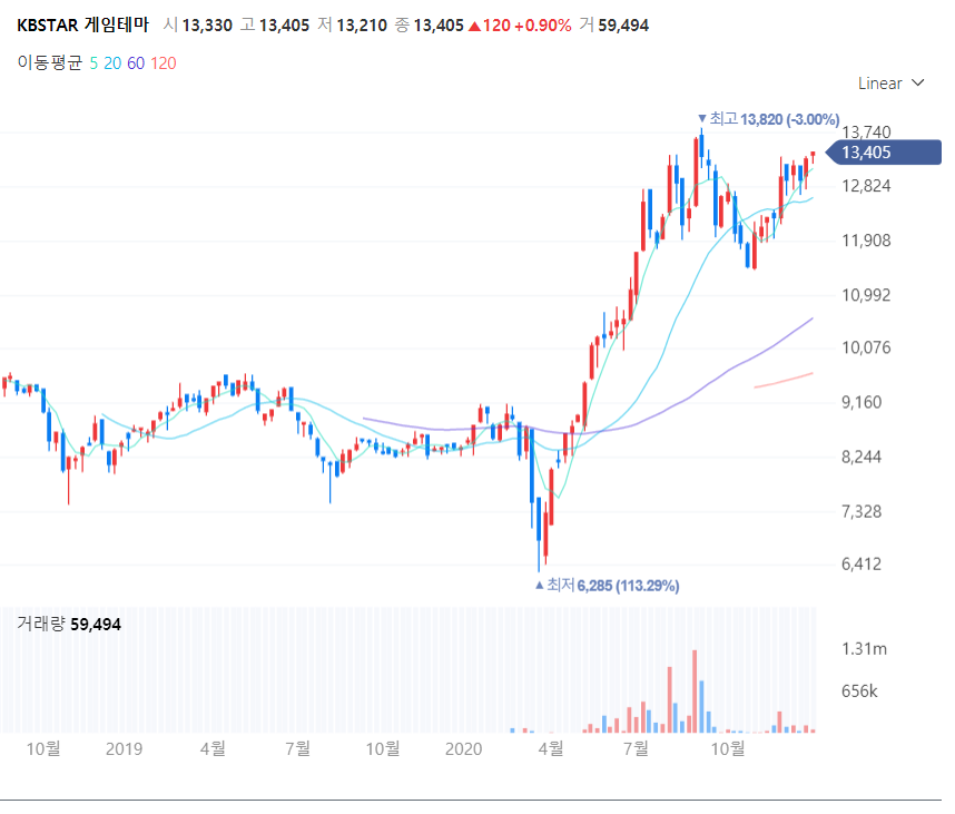 시가총액 및 거래대금을 보면 <KBSTAR 게임테마>와 <TIGER KRX게임K-뉴딜>이 제일 맘에 들었고,