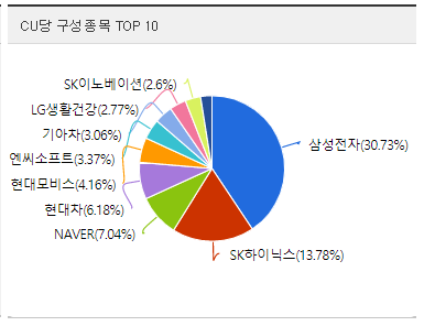 구성종목 중 상위 10개 및 최근 주봉 차트입니다. 코스피에서 무거운 종목에 대한 비중이 높으며, 요즘 주도주들이 포함된 만큼 차트 또한 급한 상승을 보이고 있습니다.