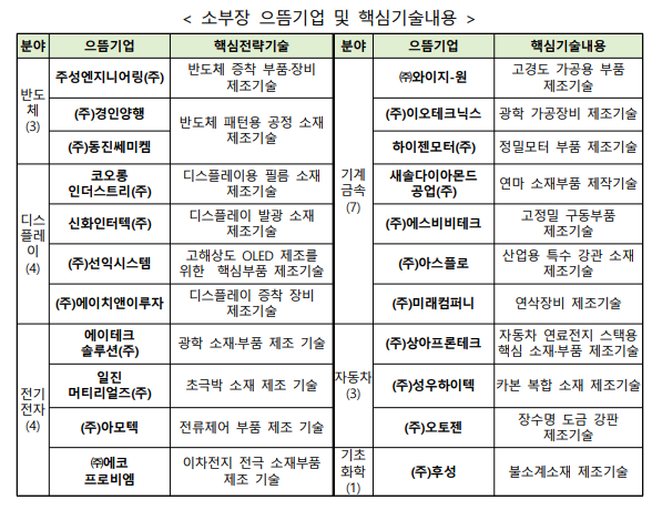 산업통산자원부에서 1월11일 '글로벌 소부장 1등 기업으로 성장할 국내 최고 기술기업'이라는 타이틀로 22개 기업을 선정했다.