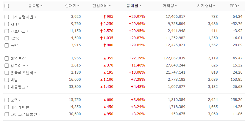 커머스 시장에서 쿠팡이 차지하는 위치가 대단히 높은만큼 나스닥에 상장할 수 있다는 기사로도 국내 주식시장에 큰 영향을 줬습니다. 30% 가까이 상승한 종목이 5개나 되네요.
