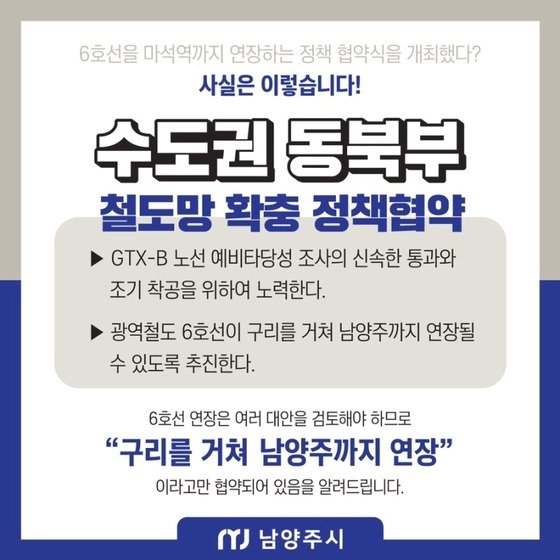 최근 조광한 남양주시장은 6호선 연장보다는 분당선-경춘선 직결연결에 주력하자고 SNS에 글을 남겼다. 아직 6호선을 포기한다는 말은 안 했으나 한발 빼는듯한 뉘앙스이며 6호선 연장을 관심 있게 지켜보는 입장에서는 좀 불안한 제스처이다. (그리고 남양주시에서는 애초에 마석으로 확정하여 진행하는 것은 아녔으며 구리를 거쳐 남양주까지 연장이 목표였다고 공시했다.)