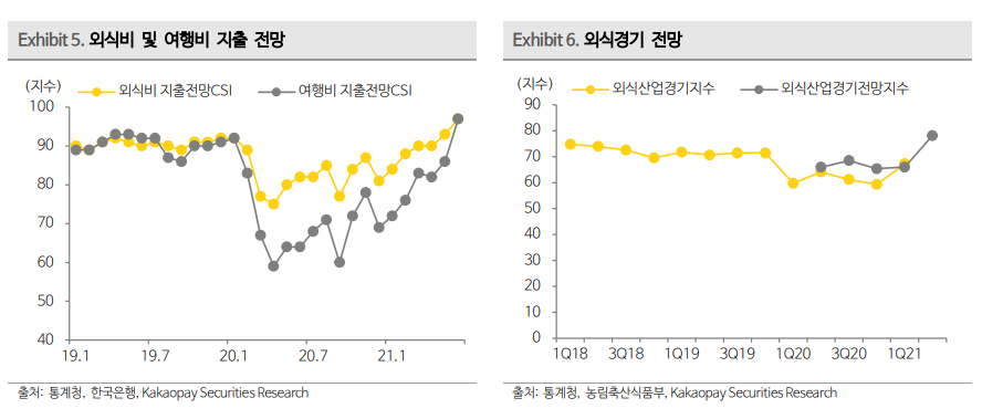 국내 1차 백신 접종비율이 30% 정도이며 완전접종 비율은 10.6%이다. 델타 변이 바이러스로 수도권 거리두기 완화가 연기되었지만 이로 인해 더욱 억눌린 수요가 증가하여 포스트 코로나 이후 소비심리가 크게 증가할 것으로 보인다.