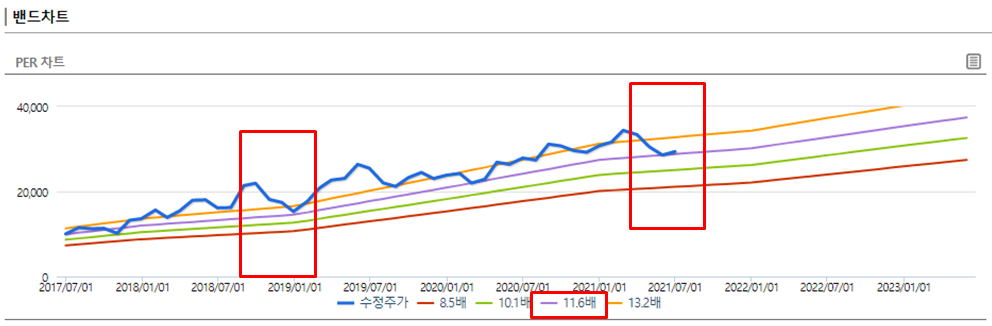 요즘처럼 유동성이 풀린 시장에서 PER 8~9 정도로 가격메리트는 크다. 하지만 현재 PER밴드상 최상단이며 과거부터 계속 싸게 거래되었던 종목이다.