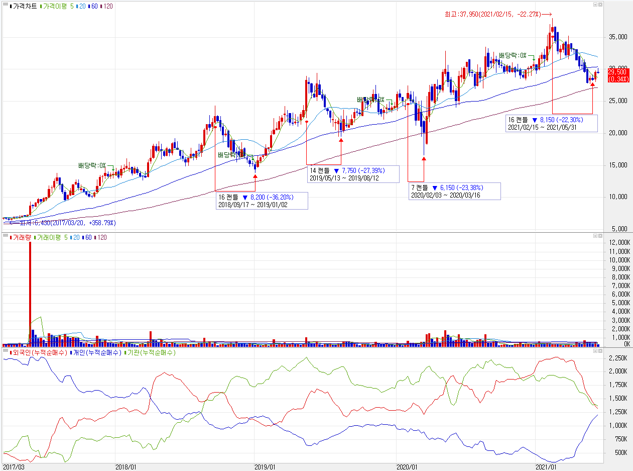아래 일봉차트를 보면 최고점인 42,300원 선까지 급하게 올랐다가 최근 크게 가격조정을 받고있다. 주가가 상승한 것은 회사가 성장하는 것에 더해 지분구조와 관련해 노이즈가 있는 것으로 보인다.(아래 지분구조와 리스크에서 정리하겠다.) 현재 가격만 놓고보면 PER 8~9정도로 올해 실적 추정치를 감안한 PER은 더욱 낮을 것이다.