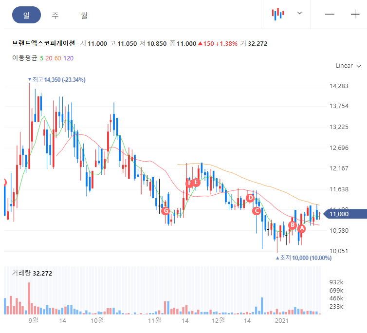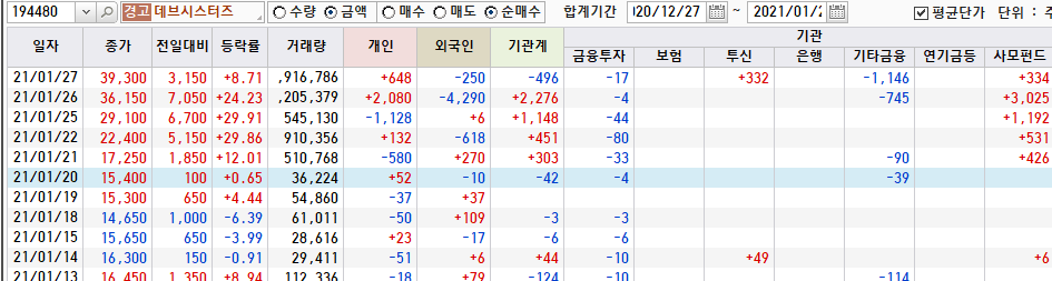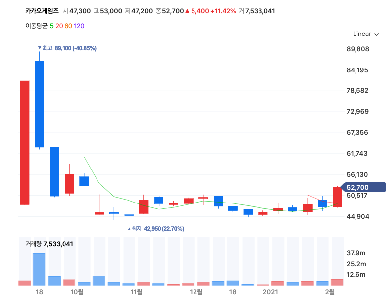 아래 투자자별 매매동향을 보면 외국인 칼럼이 거의 다 빨간색이다. 개인들은 빅히트 상장 때 급등&급락을 거치면서 물린 사람들이 많을 거라 생각되며(나 포함...) 최근 14만원 이상으로 올라가면서 던지고 나가는 형국인 거 같다. 그러거나 말거나 외국인은 꾸준히 매수 중이다.
